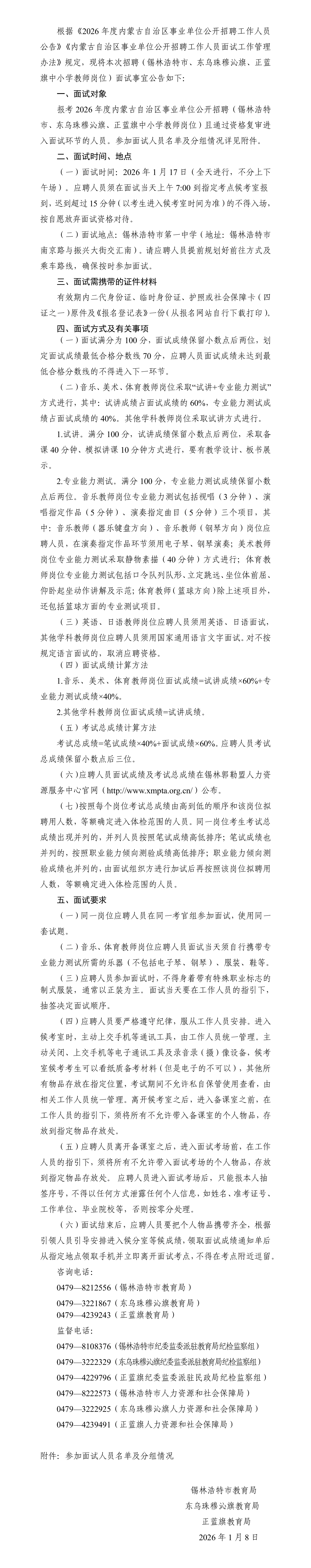 2026年度內(nèi)蒙古自治區(qū)事業(yè)單位公開招聘 (錫林浩特市、東烏珠穆沁旗、正藍(lán)旗中小學(xué)教師崗位)面試公告