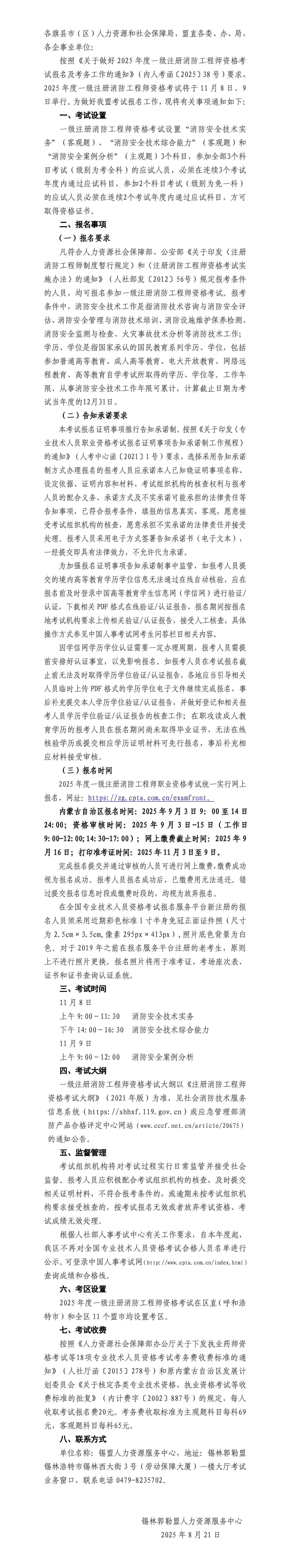 盟人力資源服務(wù)中心關(guān)于做好2025年度一級注冊消防工程師資格考試工作的通知