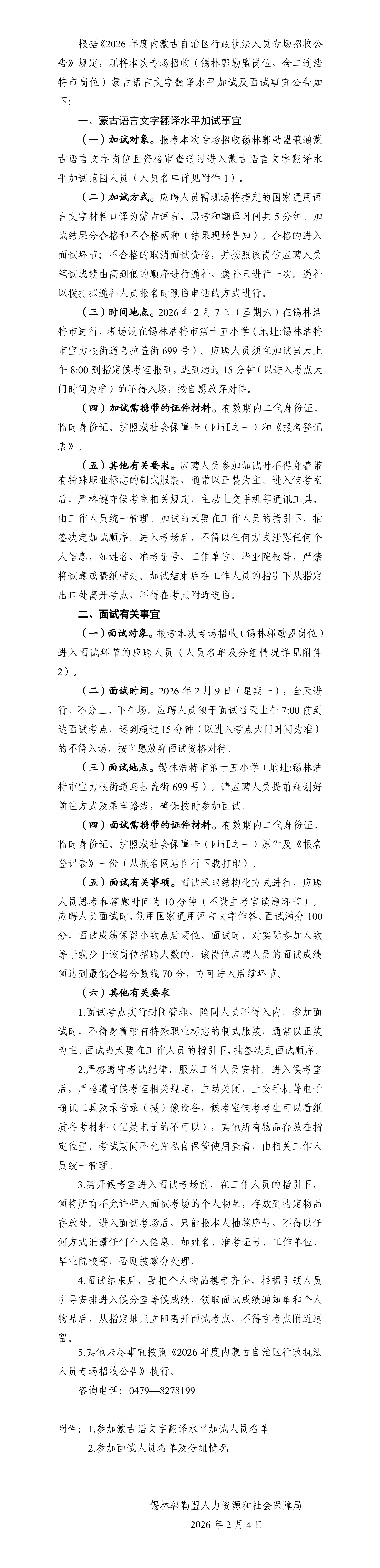 2026年度內(nèi)蒙古自治區(qū)行政執(zhí)法人員專場招收(錫林郭勒盟崗位)蒙古語言文字翻譯水平加試及面試公告