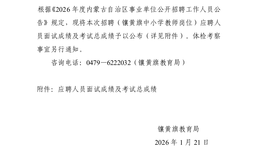 關于公布2026年度內(nèi)蒙古自治區(qū)事業(yè)單位 公開招聘(鑲黃旗中小學教師崗位)面試成績及考試總成績的公告