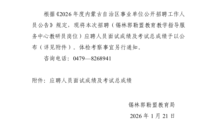 關(guān)于公布2026年度內(nèi)蒙古自治區(qū)事業(yè)單位公開招聘(錫林郭勒盟教育教學(xué)指導(dǎo)服務(wù)中心教研員崗位)面試成績及考試總成績的公告